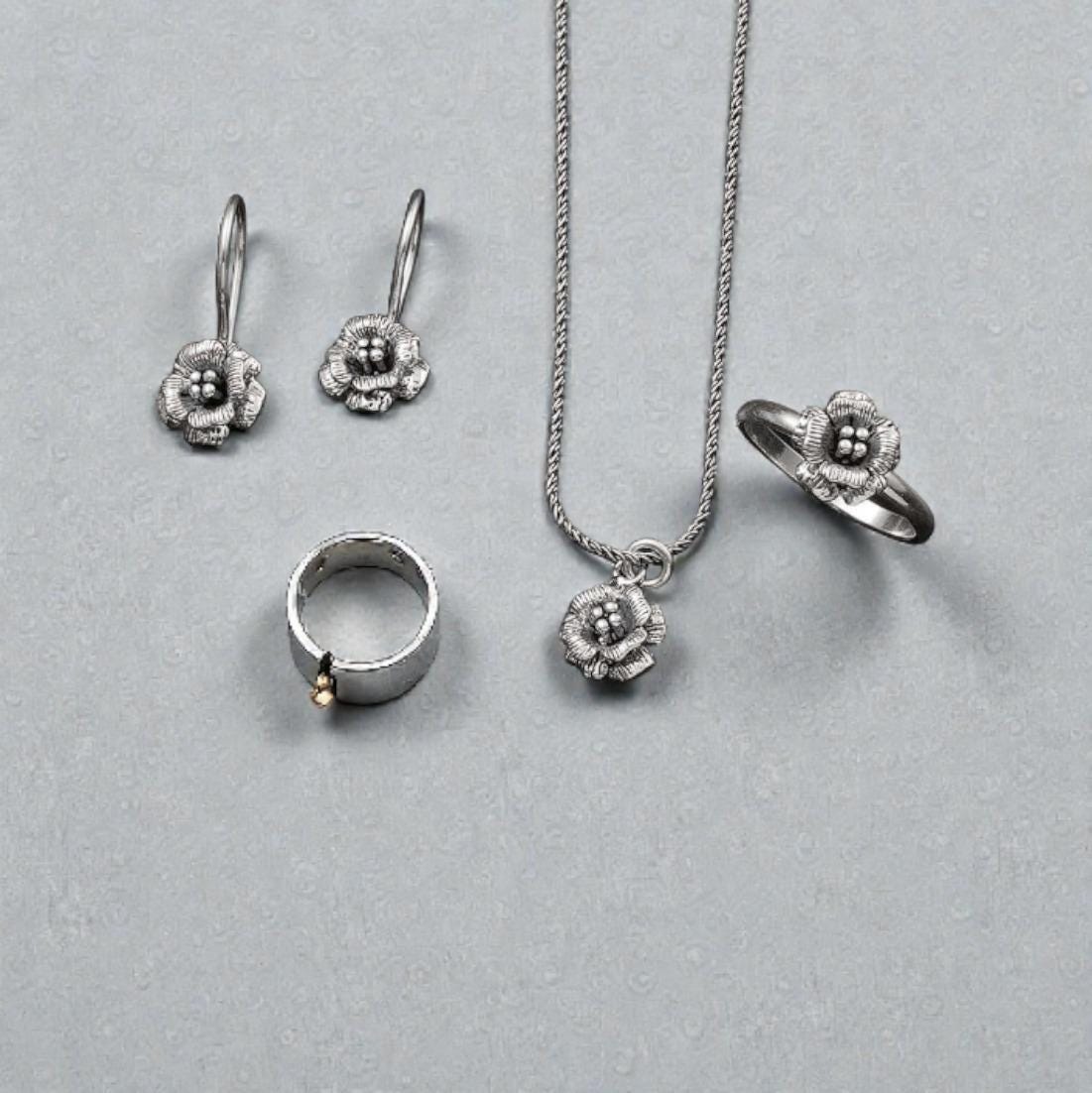 Sterling Silver Rose Jewelry Set | 925 Silver Necklace Earrings Ring | Handmade Floral Jewelry Gift for Her