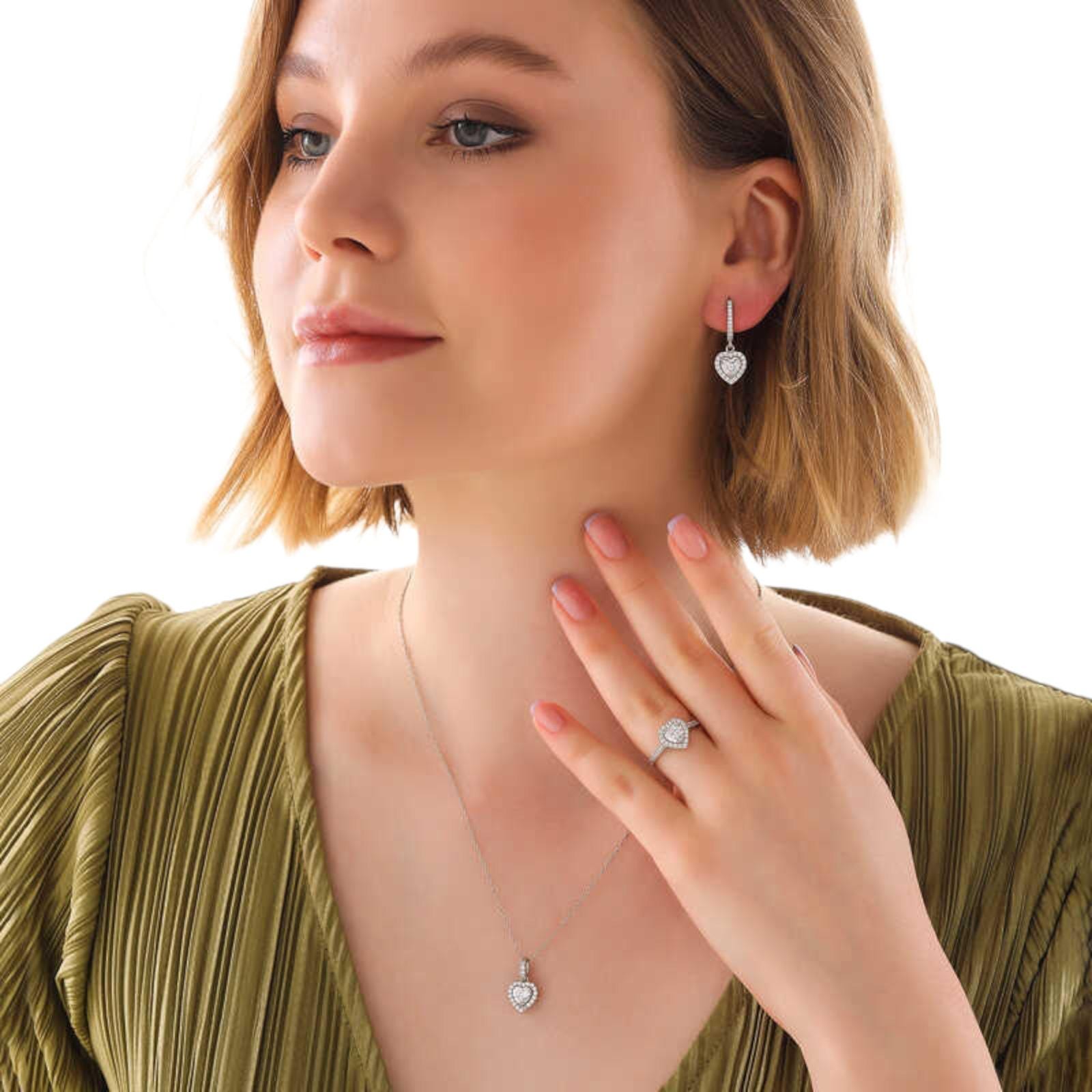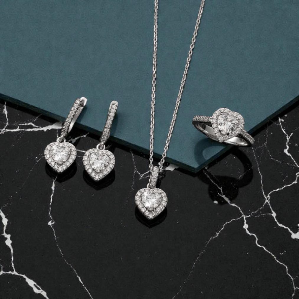 Timeless elegance meets romance. This white heart jewelry set is crafted from 925 sterling silver and finished with rhodium plating to ensure long-lasting shine and durability.