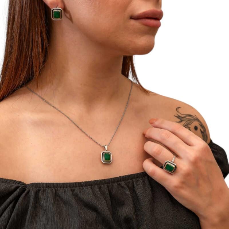 Made from 925 sterling silver and finished with rhodium plating, this set offers long-lasting shine and excellent resistance to tarnishing. The rich green stone symbolizes balance, harmony, and strength, making it a meaningful statement piece.