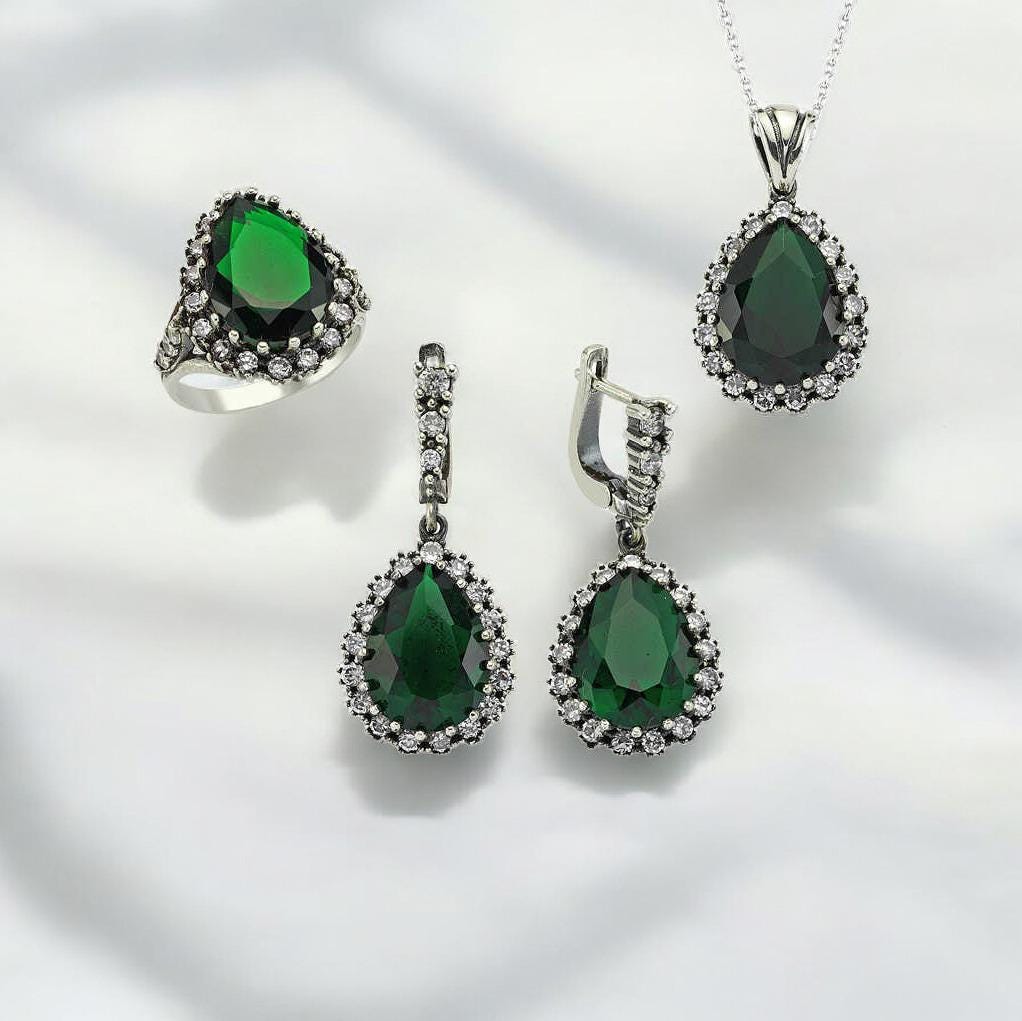Hurrem Sultan Inspired Silver Jewelry Set | Vintage Set with Emerald Green Teardrop Stone