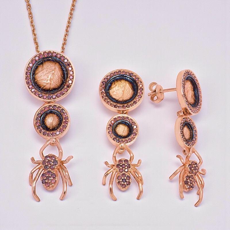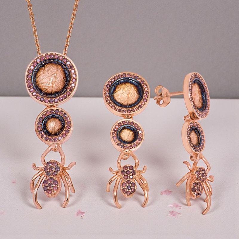 This spider and leaf jewelry set for women combines deep symbolism with elegant design. The spider represents protection, patience, and devotion, while the leaf symbolizes nature and renewal. Crafted from 925 sterling silver and finished with a warm rose gold plating, this handmade set features brown zircon stones that add a unique vintage-inspired glow. A meaningful and distinctive gift for birthdays, anniversaries, Mother’s Day, or special occasions.