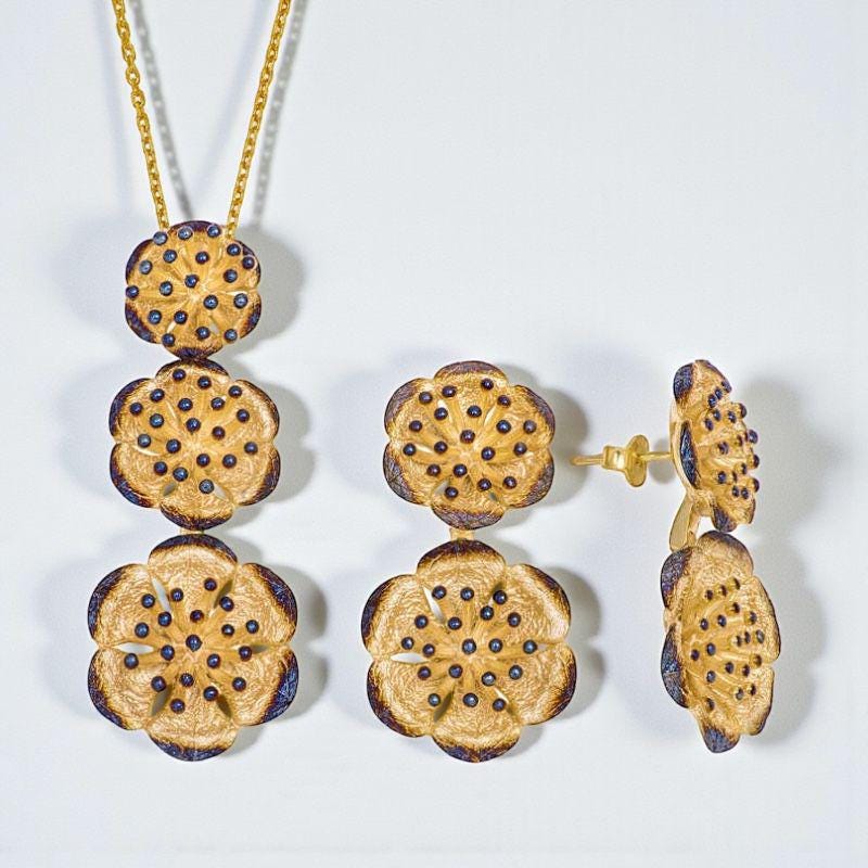 The lotus flower symbolizes purity, rebirth, and spiritual awakening. This elegant lotus jewelry set for women is crafted from 925 sterling silver and finished with a rich gold plating for lasting shine. Inspired by ancient Asian and Egyptian symbolism, this statement set is perfect for meaningful gifting or elevating everyday style. An ideal gift for birthdays, anniversaries, Valentine’s Day, or Mother’s Day.
