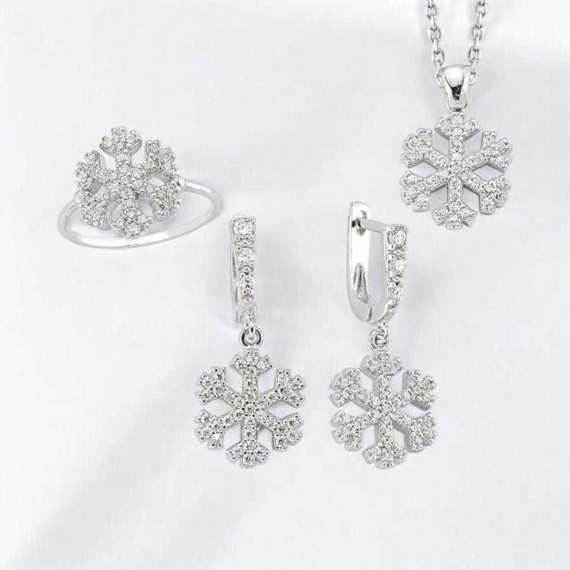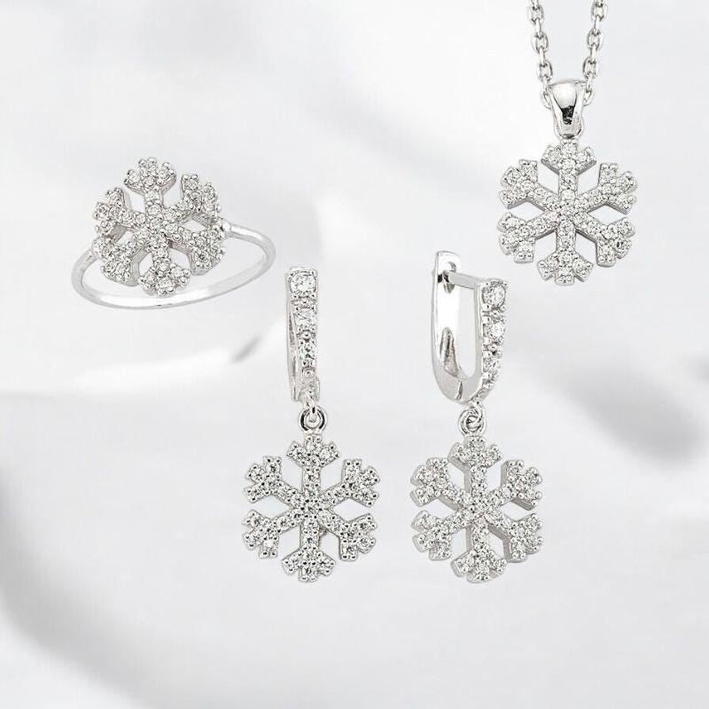 Inspired by the beauty and uniqueness of snowflakes, this snowflake jewelry set for women symbolizes individuality and love. Crafted from 925 sterling silver and finished with rhodium plating, it features sparkling cubic zirconia stones for a timeless elegance.