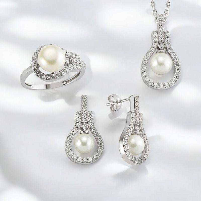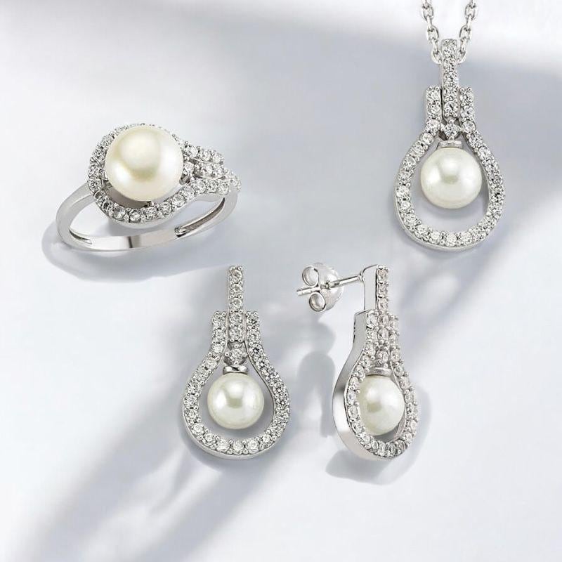 Pearl Drop Jewelry Set for Women | 925 Sterling Silver Cubic Zirconia Necklace, Ring & Earrings This elegant pearl drop jewelry set for women is crafted from 925 sterling silver and adorned with white cubic zirconia stones. The delicate pearl drop design offers a timeless and feminine look.