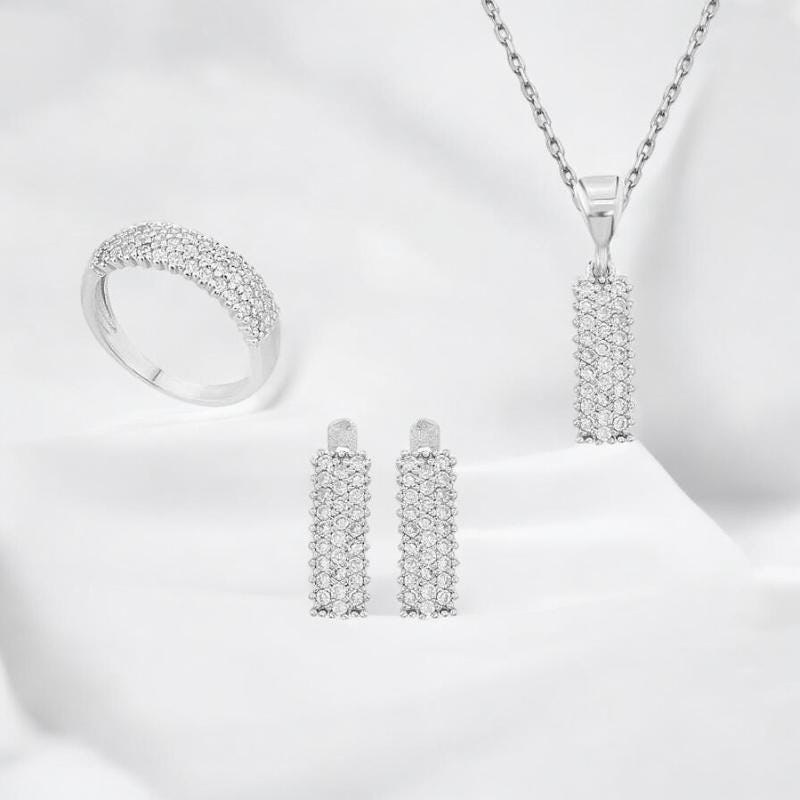 This elegant tennis-style jewelry set for women features a sleek waterway (su yolu) design adorned with sparkling cubic zirconia stones. Crafted from 925 sterling silver and finished with rhodium plating, it offers long-lasting shine and timeless elegance.