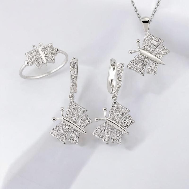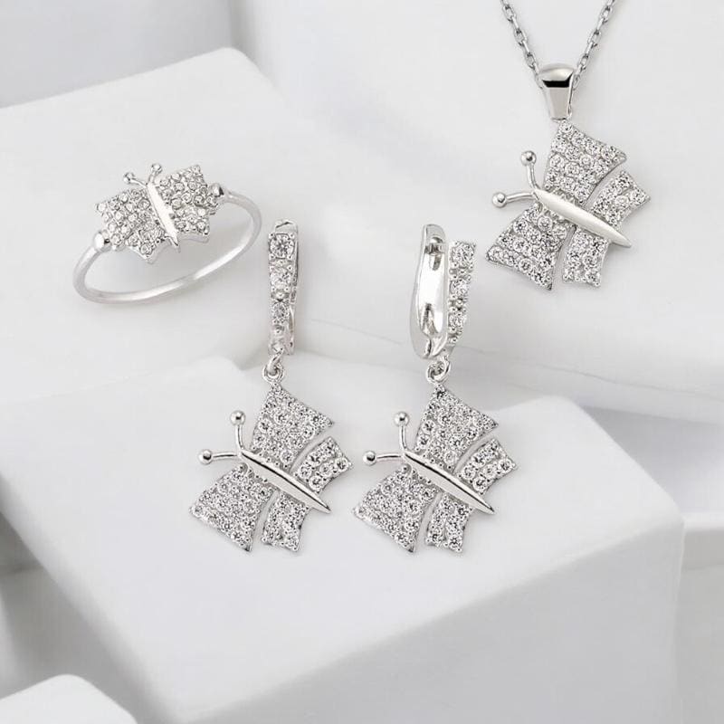 Symbolizing transformation, freedom, and elegance, this butterfly jewelry set for women is crafted from 925 sterling silver and finished with durable rhodium plating. Sparkling cubic zirconia stones add a refined and timeless touch.