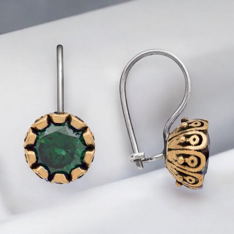 These green stone round earrings for women are crafted from 925 sterling silver and designed in an elegant ethnic style. The vibrant green zircon stone adds a fresh and natural touch, making them perfect for everyday wear or special occasions.