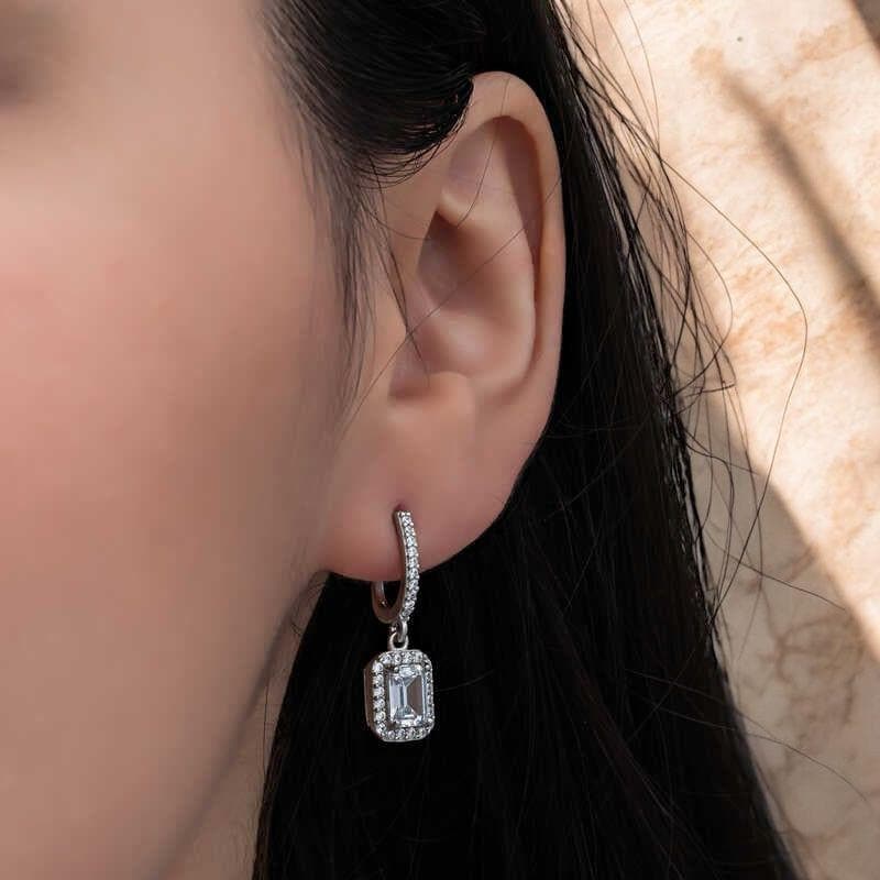 These elegant white baguette dangle earrings for women are crafted from 925 sterling silver and finished with high-quality rhodium plating for long-lasting shine.