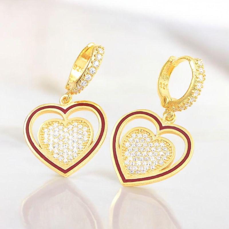 Details • 925 Sterling Silver • Gold Plated Finish • Heart Dangle Design • Cubic Zirconia Stones • Handmade Jewelry • Width: 1.80 cm • Height: 2.00 cm • Weight: approx. 5 g • Weight may vary ±10%