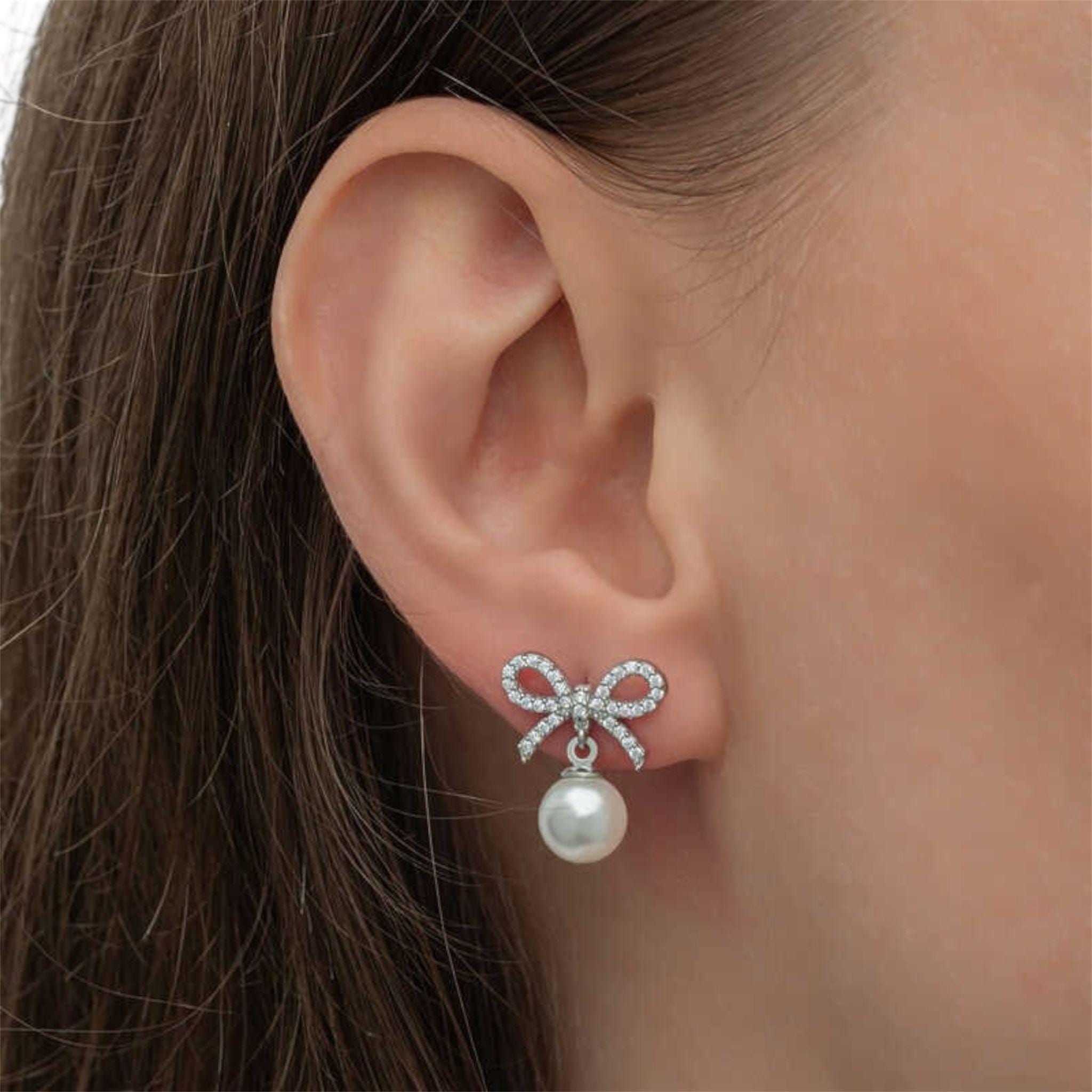 Bow Pearl Stud Earrings for Women | 925 Sterling Silver Rhodium Plated Elegant Earrings