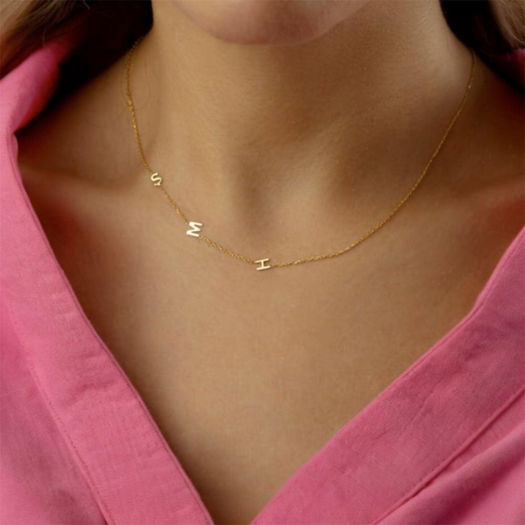 The letter detail is placed sideways on the chain, creating a clean and modern look suitable for everyday wear.