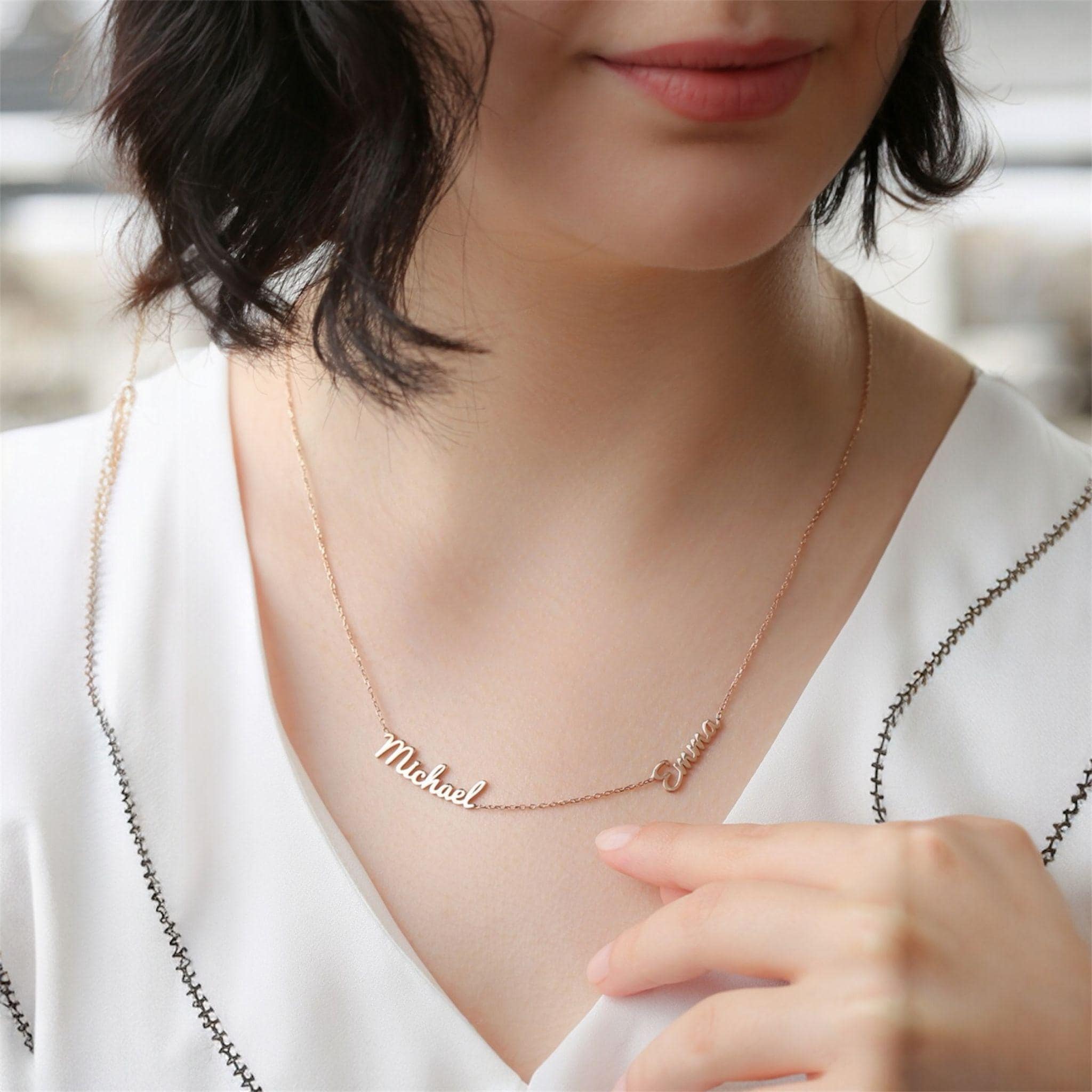 Two names are placed side by side on a fine chain, creating a meaningful and minimal look. Lightweight and comfortable, this necklace is perfect for everyday wear and special moments.