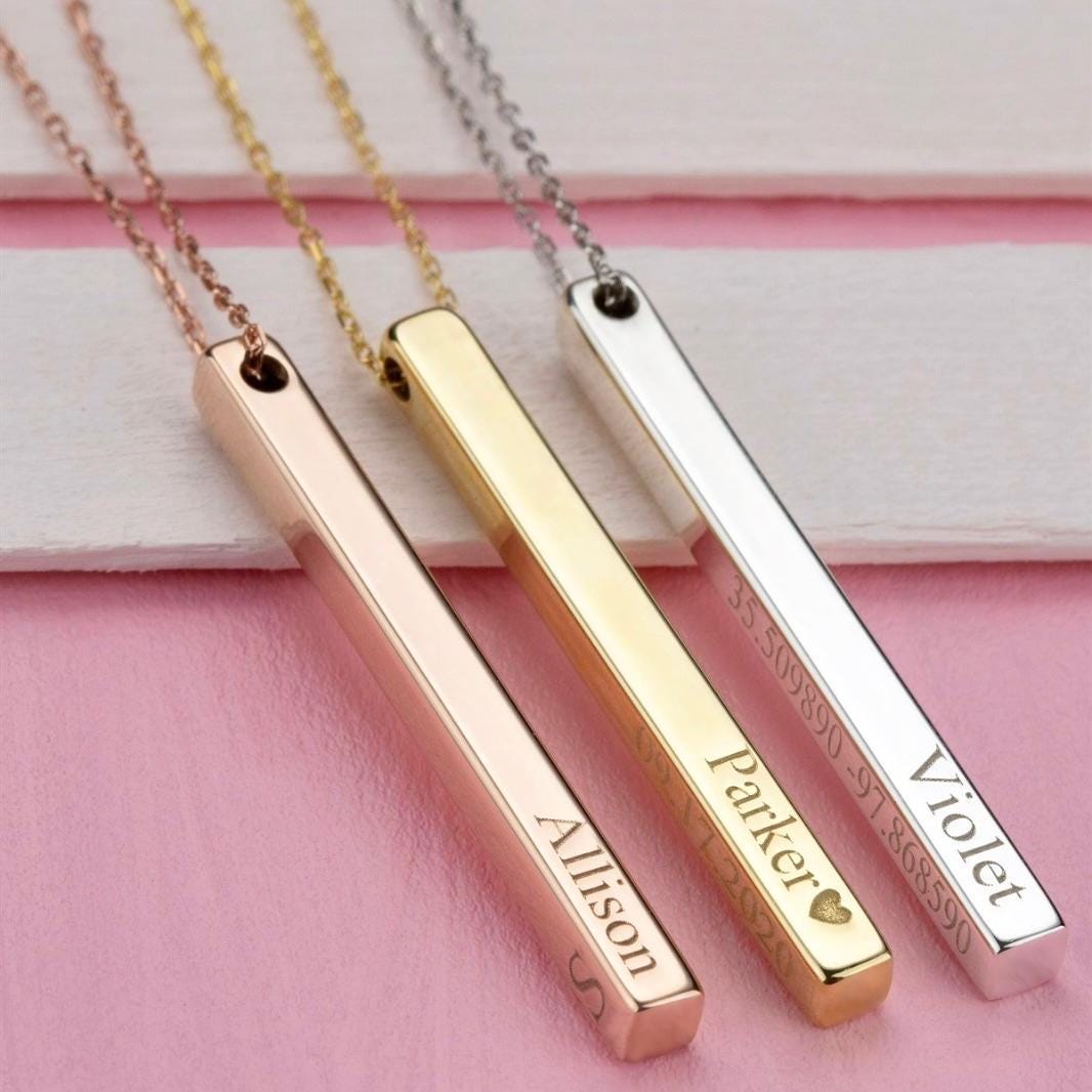 This personalized bar necklace is crafted from 925 sterling silver and customized with your chosen name, date, or meaningful word. Its minimalist and elegant design makes it perfect for everyday wear and a thoughtful gift for her.