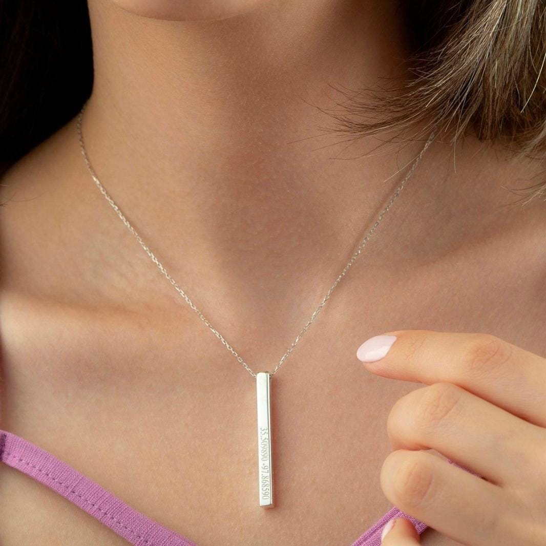 Details • Material: 925 Sterling Silver • Design: Vertical / Bar Necklace • Customization: Name or Text • Gift Ready Packaging Included