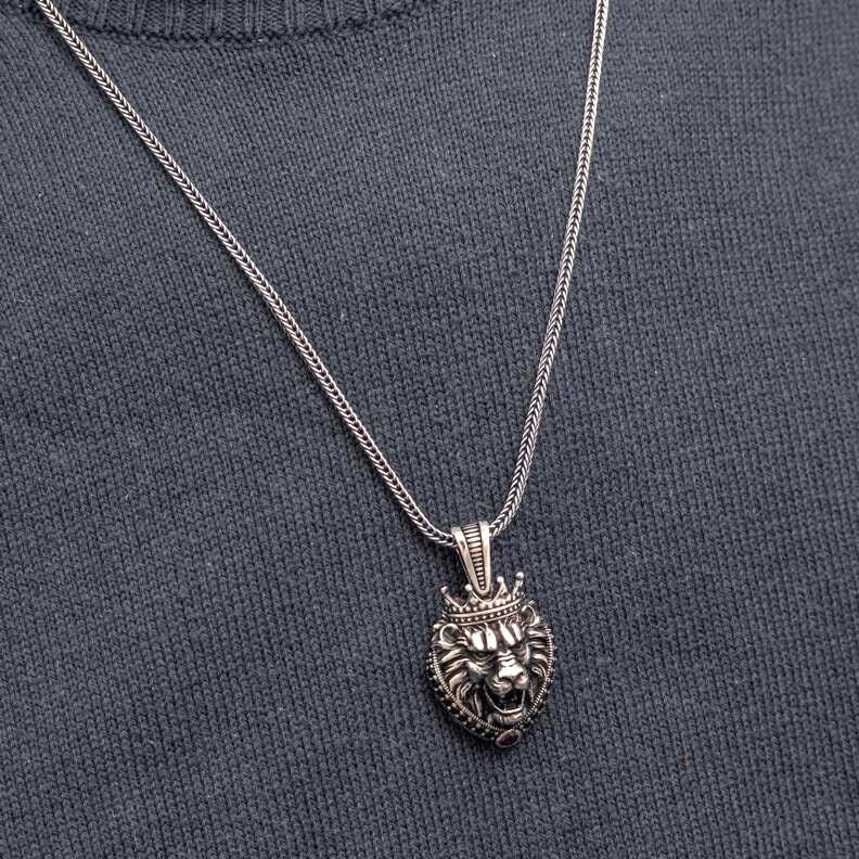 This powerful necklace features a crowned lion figure symbolizing strength, courage, and leadership.