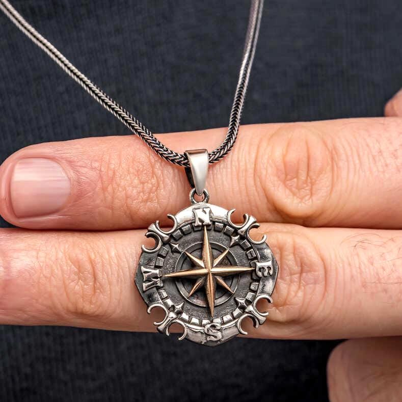 This bold necklace features an oxidized compass design symbolizing direction, adventure, and inner strength.