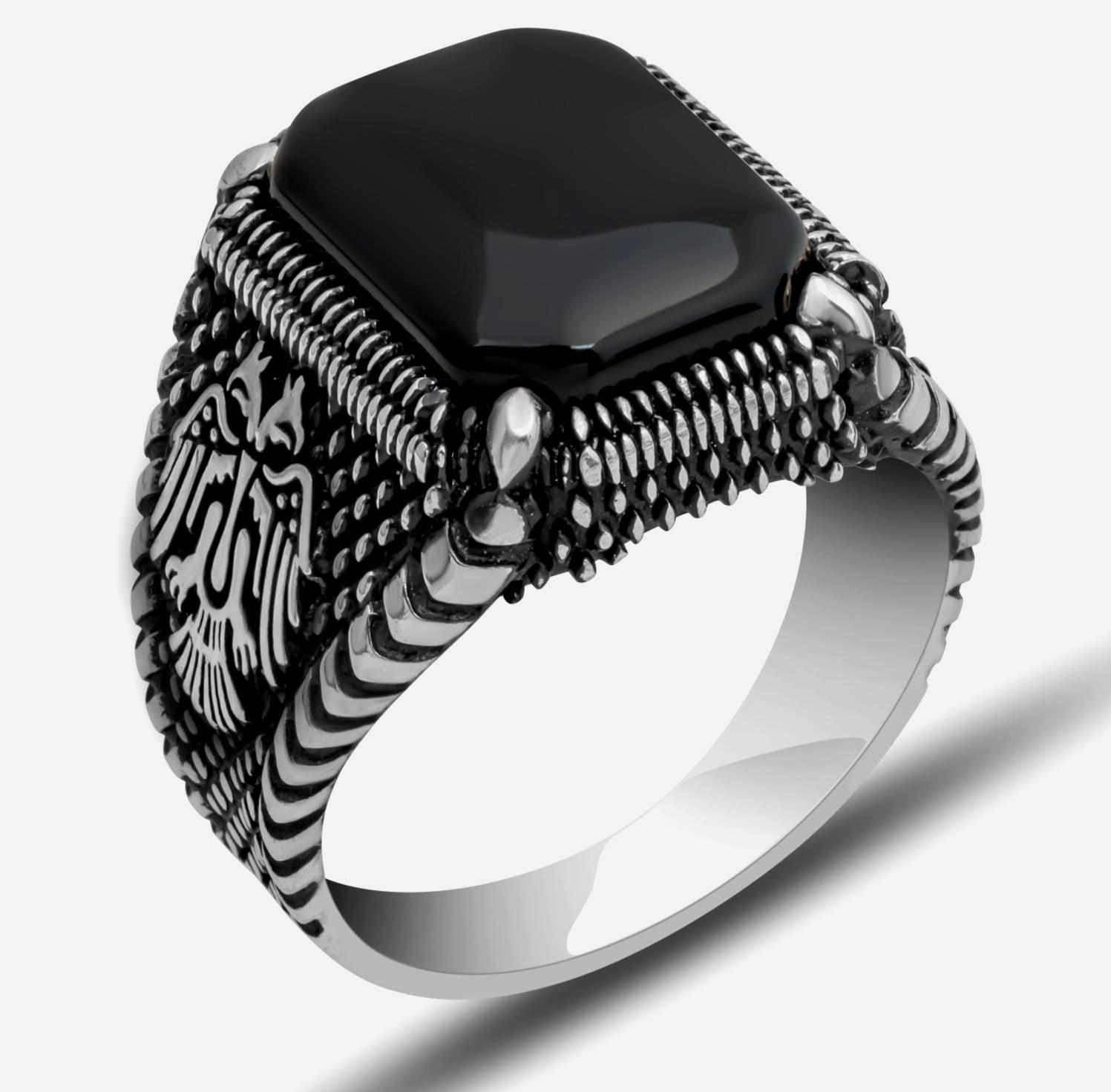 The black onyx stone is known for its protective and balancing energy, while the eagle motif symbolizes authority and bravery.