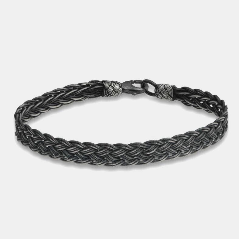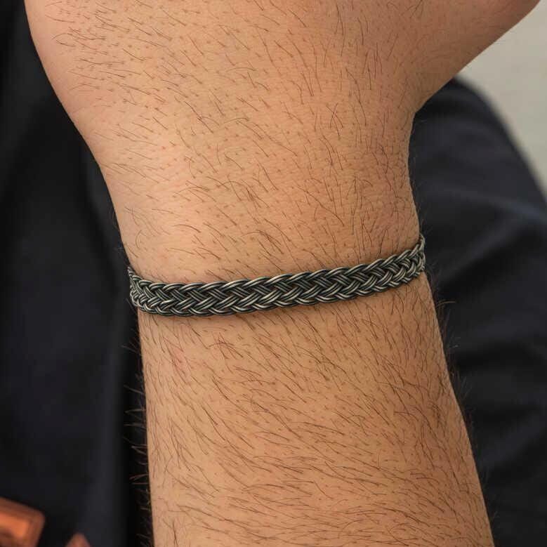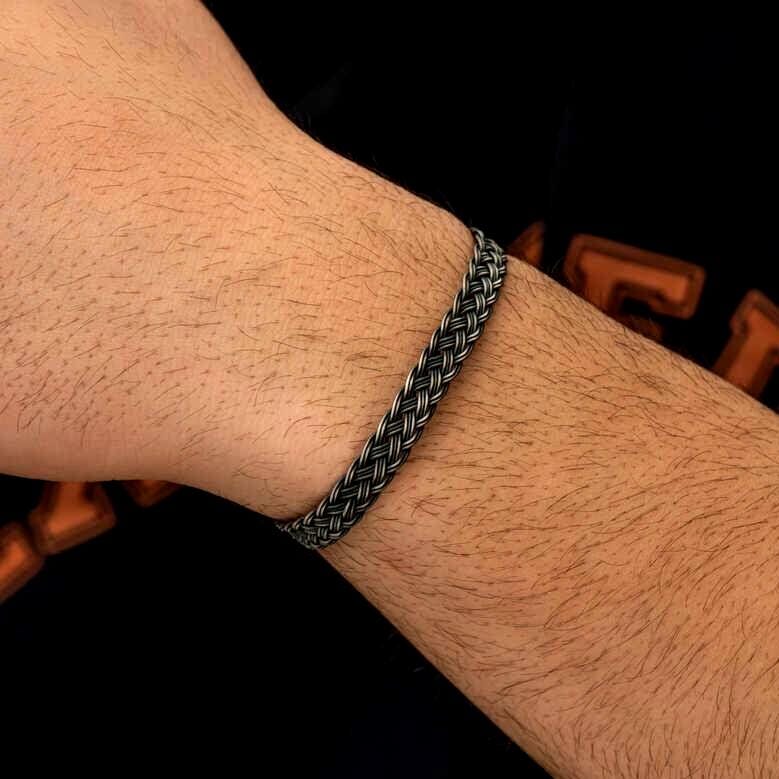The oxidized finish enhances the braided pattern and provides a timeless, masculine look suitable for both everyday wear and special occasions. Its lightweight and comfortable structure allows for long-term use without discomfort.