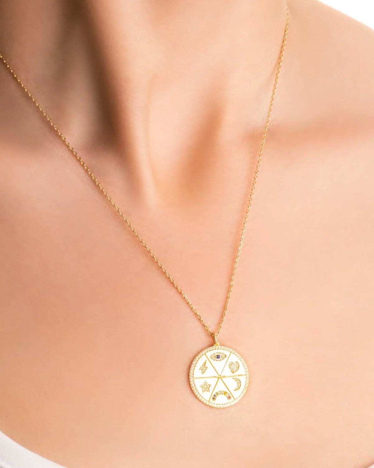 The round charm features symbolic motifs representing luck, protection, abundance, and positive energy, accented with multi-color stones for a refined and spiritual touch. Its timeless and minimalist style makes it perfect for daily wear or special occasions.