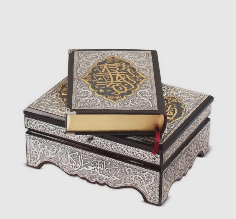 Silver Plated Holy Quran with Wooden Box Islamic Gift Set